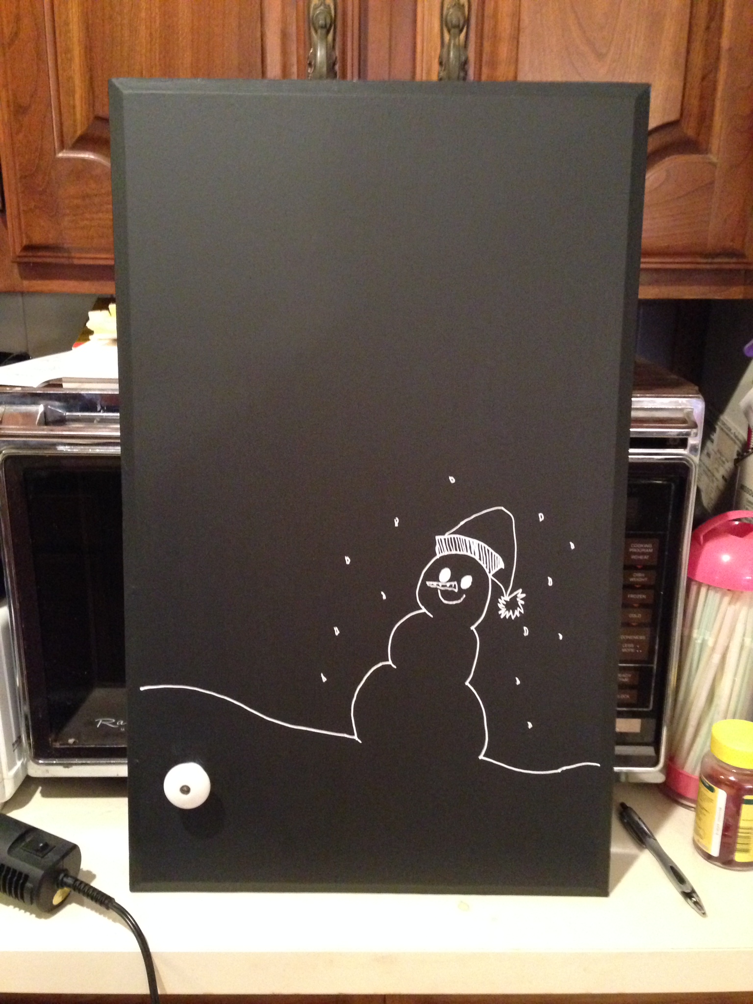 Simply sand the surface to prepare it for paint, and wipe clean of all sanding debris when done. If painting the chalkboard paint directly on a wood surface, I found that I only needed a couple of coats for a good coverage and writing surface. For the cabinet door with the glass or plexi interior, I taped off the glass edges while painting the frame with the secondary color, then painted the chalkboard paint afterward. On glass or plexi, it will take about 3 coats of the chalkboard paint to get a good coverage. I also recommend painting it on a level surface as opposed to standing it up to help avoid drips or thick spots in the paint. Using the foam brush also helps avoid any excess brush marks. When getting ready for your final coat of paint for glass or plexi I found that it was helpful to hold it up to the light as this will help you find any spots that might be a little thin on paint and you can be sure you get good coverage on your final coat. When your last coat is dry, then have fun creating your design! You can use the chalk ink for a fine lined design, or if you prefer the look of regular chalk you can go that route. Both are washable should you get tired of the design and want a change in the future, or want to update it with a holiday theme. If you need some inspiration, Pinterest is a great resource for many chalkboard ideas. I have a board created on my Pinterest page dedicated to just chalkboard ideas. Click on over using the link provided if you would like to see some more ideas. So don’t be afraid to try it, it’s a lot easier than you would think!